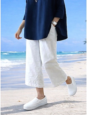 Dame Capri-bukser Imitert bomullslin Bred Bukseben kinesisk Ferie Mote Gatemote Full lengde Høy Midje Helfarge Lomme Elastisk midje comfy Myk Bekvem Mikroelastisk utendørs Feriereise Gate Hvit Sommer