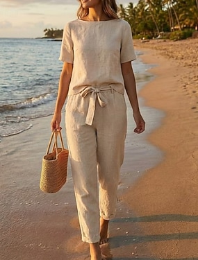 Dame Skjorte Todelt sett Imitert bomullslin Løstsittende shorts Kortermet Crew-hals Helfarge Lapper Mote Gatemote Avslappet Daglig Arbeid Rød Marineblå Kakifarget Vår Løstsittende