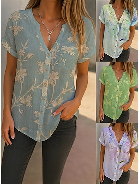 Dame Bluse Skjorte i imitert lin Knapper Trykt mønster Blomstret Årgang Stilfull Fritid Kortermet V-hals Vanlige topper Daglig Blå Lilla Grønn Lyseblå Sommer Vår