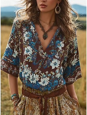 Dame Skjorte Boho skjorte Imitert bomullslin Trykt mønster Blomstret Grafisk Bohem Årgang Klassisk Langermet V-hals Vanlige topper Daglig Ferie Ut på byen Gul Sommer Vår Høst