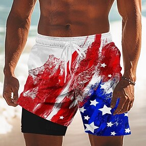 Uavhengighetsdag Menns US-Flagg Patriotiske Fjerde Juli Fôrede Shorts 2 i 1 Board Shorts Svømmebukser Midje Ferie Sidelommer Med Kompresjonsfôr Elastisk