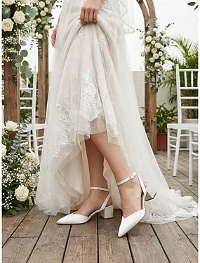 Hvite blondehæler til bryllup med spenne – elegante platåsko med åpen tå til innendørs bryllup og spesielle anledninger
