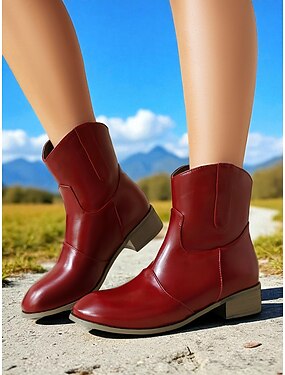Damestøvletter i vinrødt i kunstskinn – avslappede, korte støvletter i vestlig stil med lav hæl for jobb, reise og hverdagsantrekk