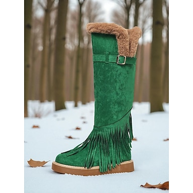 Grønne damesnøstøvler i semsket skinn med frynser og pelsfôr – stilige knehøye vinterstøvler til kaldt vær, snø og utendørseventyr