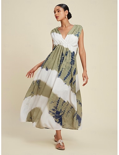 Dame Elegant kjole Lang kjole Maxikjole Grønn Ermeløs Skyggelegging Printer Sommer V-hals Ferie Fritid hverdag S M L