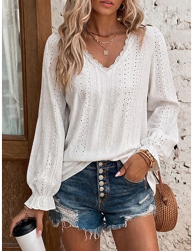 Kvinne Elegant Blonde Topper Øyelet Bluse Uformell Ensfarget Vanlige Topper Lange Ermer Rund Utrigning Blonde Lappverk Vanlig Passform Daglig Grå Romantisk Petit Topper Sommerferie Antrekk