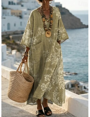 Dame Maxikjole Skiftkjole Ferie Fritid Bohem utendørs Strand Ut på byen Løstsittende Blomstret Grafisk Langermet V-hals Grågrønn Svart Lysebrun Sommer Vår