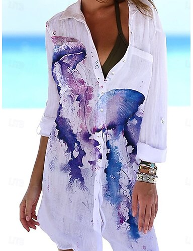 Kvinnens mini kjole skjortekjole Dekke opp Strandklær Mini Kjole Lomme Print Fashion Uformell Fisk Nedbrett 3/4 Lengde Erme Løs Passform Utendørs Daglig Hvit Blå 2023 Sommer Vår S M L XL