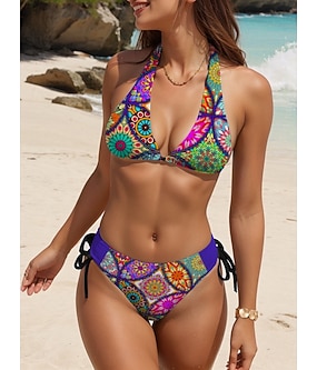 Dame Bikini 2-delt Badedrakt Boho Cheeky Ryggløs Slank Ferie Strandtøy Blomster V-hals Ermeløs Badedrakt