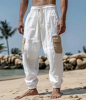 Herre Militærbukser Linbukser Bukser Sommerbukser Posete bukser Snorer Elastisk midje Multi lomme عادي Komfort Pustende Full lengde utendørs Ferie Ut på byen Ferie Mote Løstsittende Svart Hvit