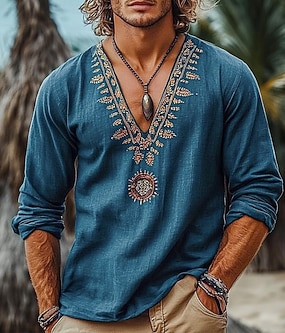 Herre Skjorte Linskjorte Sommerskjorte Strand Klær Skjorte med knapper عادي Feriereise Ferie Blå Svart Hvit Navyblå Langermet Krage Sommer Vår Klær Broderi