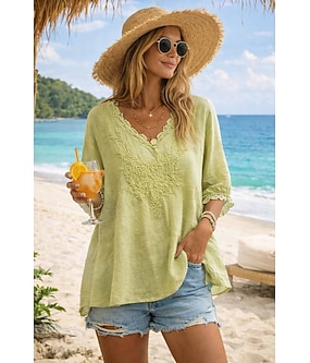 Dame Skjorte Skjorter i bomullslin Bluse Broderi Helfarge Mote Fritid Rund hals Daglig Gate Hvit Gul Rød Grønn Kakifarget Sommer