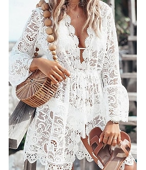 Dame Mini kjole Hvit kjole Strandkjole Svart kjole Dekke Opp Elegant Årgang Mote Kjegle Erme Daglig utendørs Strand Normal Blomstret عادي Langermet V-hals Svart Hvit Sommer Vår