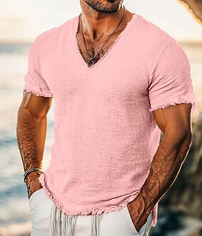 Herre T-skjorte T-skjorte i lin Kort Erme V-hals Sommer عادي Mote Designer Grunnleggende Myk Feriereise Gate Fritid / hverdag Hvit Rosa Burgunder Topp T-skjorte for menn