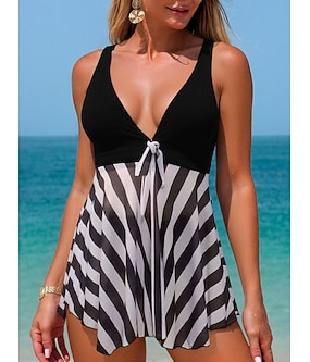 Dame Badetøy Tankini 2 stk Underbukser Badedrakt Midjekontroll Høy Midje Tynn Åpen rygg Ferie Strand Klær Stripet V-hals Ermeløs Badedrakter