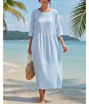 Dame Midikjole 100% قطن Skiftkjole Kaftan-kjole Uformell kjole Mote Grunnleggende Klassisk Daglig Strand Helg Normal عادي Halvlange ermer Crew-hals Hvit Rosa Lyseblå Sommer