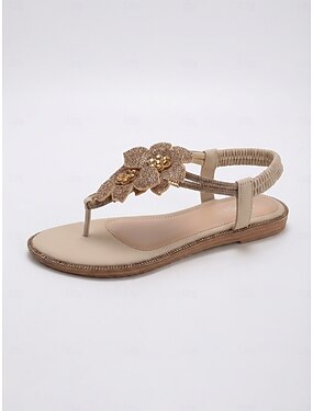Gullfargede blomstersandaler til dame – elegante, skimrende, flate sandaler med 3D-blomsterdetaljer, komfortable pensko med stropper for kvelder på feriesteder og middager på ferier. &cruiseklær