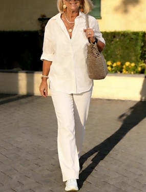 Dame Skjorte Linsett i bomull Todelt sett Langermet Lang bukse Knaphul Ren farge Knapper Enkel Fritid Komfort Daglig Hjem Gate Blå Svart Rosa Sommer
