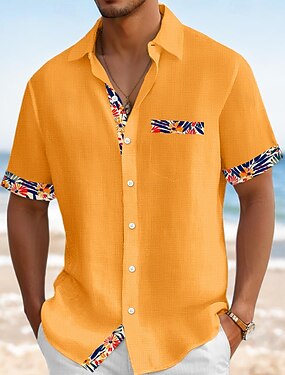 Herre Skjorte linskjorte retro skjorter Vintage skjorte Etnisk skjorte Blomstret utendørs Arbeid Blå Oransje Grå Kortermet Aftæpning Sommer Vår Klær
