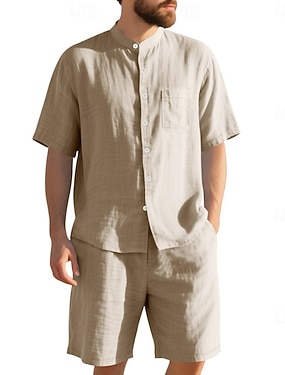 Herre Linskjorte 2 deler Skjortesett Og Shorts Lin Shorts Strandshorts Sett عادي Daglig utendørs Strand bestefars krage Kortermet Sommer Mote Fritid Bekvem Klær
