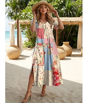 Dame Midikjole Kjole med A-linje Fritid Daglig Løstsittende Blomstret Grafisk Kortermet Crew-hals Blå Rosa Lilla Grønn Sommer Vår