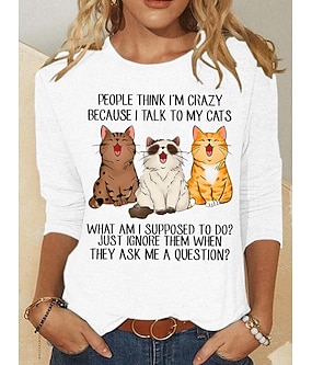 Jul Dame T skjorte Trykt mønster Grafisk Dyr Katt Årgang Mote Stilfull Langermet Crew-hals Vanlige topper Daglig Helg Blå Svart Hvit Rosa Grønn Vår Høst