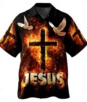 Herre Korsfarerne Kors Jesus Skjorte Skjorte med knapper Camp skjorte Kortermet Vintage retro Gateklær Ferie Sommer Vår cubansk krage 3D-utskrift Blå Svart Brun