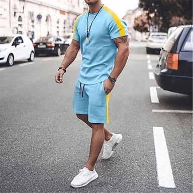 Herre Treningssett Joggedress T-skjorte og shorts Sett Antrekkssett Crew-hals utendørs Daglig Sport Lomme Snorer 2 deler Fargeblokk Sjø blå Svart / Hvit Vinrød Polyester Sportsklær Klassisk Fritid