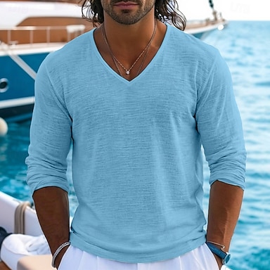 Herre T-skjorte T-skjorte i lin Langermet V-hals Vår sommer Sommer Vår Helfarge عادي Daglig Fritid Gate stil Ren Avslappet utendørs Gate Lys Rosa Lyseblå Sjø blå Topp T-skjorte for menn