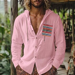 Herre Skjorte Linskjorte Sommerskjorte Strandskjorte Skjorte med knapper Skjorte med hette Bohem Avslappet Feriereise Rosa Grønn Langermet Med hette Sommer Vår Klær Lapper