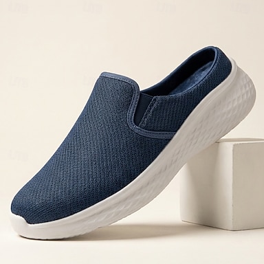 Herre marineblå strikkede slip-on joggesko med lette, pustende og komfortable tursko for hverdagsbruk, reiser, pendling, friluftsliv, helgeaktiviteter og enkel sport, avslappet stil