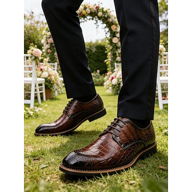 Herresko med brunt krokodillemønster i kunstskinn, elegant vingetuppstil, pensko til fester og eksklusive anledninger og bryllup