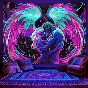 Blacklight-teppe UV-reaktiv veggdekorasjon med engelvinger som lyser i mørket, Blacklight-plakat til soverom, fest, sovesal og festivaldekor