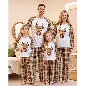 Familiestil Jul Julefamiliepyjamas Pyjamas Familiesett Grafisk Ruter Rådyr Hjem Trykt mønster Brun Langermet Daglig Matchende antrekk