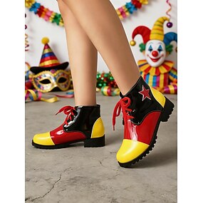 Røde ankelstøvletter med patenttrykk til dame – korte støvletter med spillkorttema til karnevalkostymer, klovne-cosplay og halloween