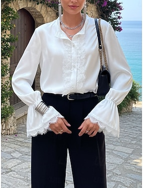 Dame Skjorte Elegant Satengtopp Bluse Lapper Blondestrim عادي Stilfull Langermet Crew-hals Vanlige topper Daglig Ferie Ut på byen Hvit Høst