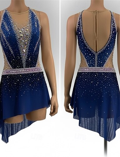 Kjole til kunstløp Dame Jente Skøyteløp Kjoler Blå / Svart Lapper Asymetrisk kant Netting Spandex Høy Elastisitet Trening Konkurranse Skøyteklær Klassisk Krystall / Rhinstein Ermeløs Skøyting Kunstløp