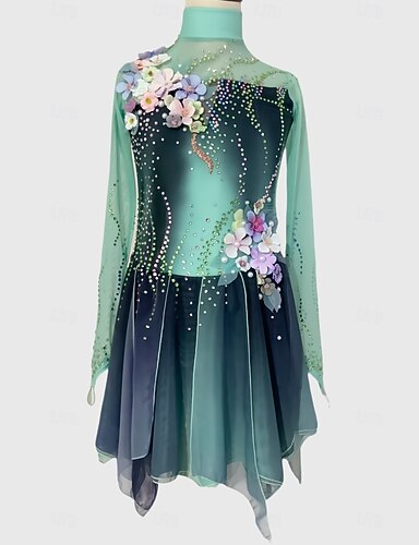 Kjole til kunstløp Dame Jente Skøyteløp Kjoler Mineral Grønn Lapper Tommelhull Netting Spandex Elastisk Trening Profesjonell Konkurranse Skøyteklær Hold Varm Krystall / Rhinstein Langermet Skøyting