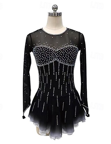 Kjole til kunstløp Dame Jente Skøyteløp Kjoler Svart / Hvit Lapper Tommelhull Netting Spandex Elastisk Trening Profesjonell Konkurranse Skøyteklær Hold Varm Krystall / Rhinstein Langermet Skøyting