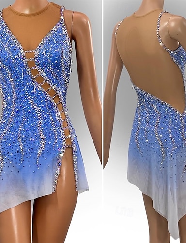 Kjole til kunstløp Dame Jente Skøyteløp Kjoler Himmelblå Lapper Asymetrisk kant Spandex Netting Høy Elastisitet Trening Konkurranse Skøyteklær Klassisk Krystall / Rhinstein Ermeløs Skøyting Kunstløp
