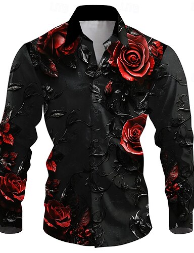 Valentondag herre blomster print kostymer skjorte knapp opp skjorte langermet vintage retro gave ferie festival sommer høst nedbrett 3D print krageskjorter svart