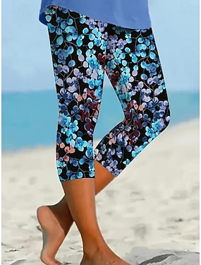 Dame Leggings Capri Bukser Høy Elastisitet Ferie Mote Hawaii Ankellange Midje Blomstret Trykk Termisk Varm Pustende Myk Ferie Avslappet Daglig Svart og Blå Sommer Vår