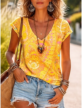 Dame T skjorte Trykt mønster Blomstret Grafisk Graffiti Bohem Årgang Fritid Kortermet V-hals Vanlige topper Daglig Blå Svart Hvit Gul Lilla Sommer Vår