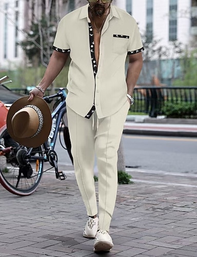 Herre T-skjorte drakter Skjorte- og buksesett 2 stk antrekk Kortermet Knaphul Sommer Fargeblokk Mote Fritid 2 deler Feriereise Dagligdagstøy Ut på byen Svart Hvit Vin Topp T-skjorte for menn