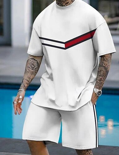 Herre Stripet 2stk T-skjorter sett Sommertopper Kortermet Korte bukser Crew-hals Sport Fritid trendy utendørs Feriereise Sport 3D-utskrift Sommer Rød