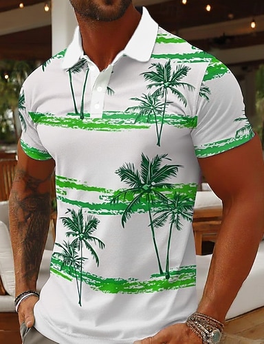 Herre Palmetre Poloskjorter Kortermet Poloskjorter Skjorter med krage Fritid treningsklær Ferieklær 3D-utskrift Knapper Pustende netting Vår sommer Blå Brun Grønn