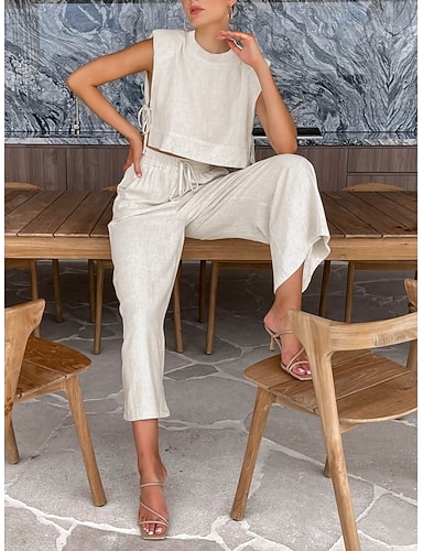 Dame Linsett i bomull Todelt sett Camis Ermeløs Crew-hals عادي Ferie Mote Gatemote Avslappet Daglig utendørs Blå Rosa Oransje Sommer Normal