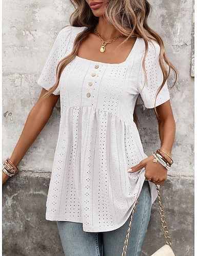 Dame Skjorte Pointelle-skjorte Øyetopp Bluse Knapper عادي Årgang Stilfull Klassisk Kortermet Firkantet hals Vanlige topper Avslappet Daglig Strand Svart Hvit Rosa Himmelblå Grønn Sommer Vår