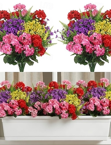 5 bunter luksuriøse kunstige geraniumblomster, falmebestandige UV-beskyttede kunstige blomster med grøntområder, vedlikeholdsfrie dekorative planter til hjem, terrasse, veranda, vinduskasse, hengende