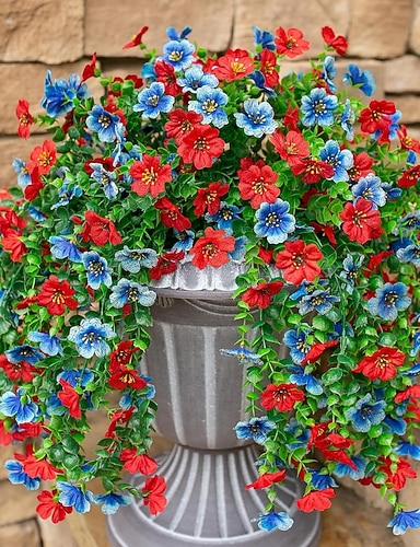 2/4 stk. utendørs dekorative kunstige blomster, kunstige hengende vår- og sommerdekorasjoner, røde og blå kunstige planter, UV-bestandige og falmebestandige silkeblomster egnet for veranda, terrasse
